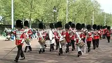 A Corps of Drums, also sometimes known as a Fife and Drum Corps, Fifes and Drums or simply Drums is a unit of several national armies. Drummers were originally established in European armies to act as signallers.[1] The major historical distinction between a military band and a corps of drums was that 'drummers' were not employed to play their instruments to entertain or delight, but instead carried out a utilitarian battlefield role. This role was fulfilled by trumpeters or buglers in the cavalry and the artillery, who did not form into comparative formed bodies in the way that drummers did; therefore, an orthodox corps of drums will exist in the infantry arm.
