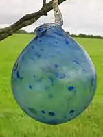 This was part of a broader fear of spirits that might flit into dwellings. Witch bottles were common throughout Europe – bottles or glass spheres containing a mass of threads, often with charms entangled in them. Its purpose was to draw in and trap evil and negative energy directed at its owner. Folk magic contends that the witch bottle protects against evil spirits and magical attack, and counteracts spells cast by witches, also forestalling the passage into habitations of witches flying about at night.[28] A witch ball was much the same; however, a more light-hearted belief was that the witch saw her distorted face in the curved glass and was frightened away. The term witch ball is probably a corruption of watch ball because it was used as a guard against evil spirits.