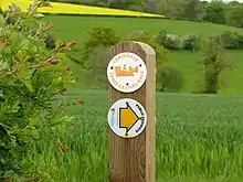 The Corvedale Three Castles Walk[1] is a waymarked recreational circular walk of about 11.5 miles (18.5 km) located in the Corvedale, Shropshire, England. The walk is classed as Easy and Heritage by the Long Distance Walkers Association.[2] The walk nominally starts (and ends) at the public car park opposite the Swan Inn in Aston Munslow, but other starting points are possible although parking is limited. The walk goes past Broncroft Castle (52.476422°N 2.672107°W), Corfham Castle (earthworks) (52.460758°N 2.700383°W), and Corfton Castle (earthworks) (52.458237°N 2.740205°W). A leaflet is available detailing the walk and can be obtained from some local pubs and retailers. Some bed and breakfasts also have it available. In addition there is a book Castle and Corvedale[3] available from the same sources.
