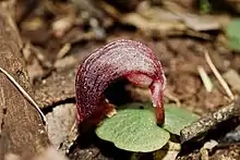 Corybas dowlingii, commonly known as red lanterns,[2] is a rare species of terrestrial orchid endemic to New South Wales. It grows in colonies and has a round or heart-shaped leaf and a dark purplish red flower with white patches in the labellum.