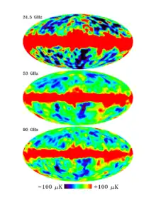 The DMR was able to spend four years mapping the detectable anisotropy of cosmic background radiation as it was the only instrument not dependent on the dewar's supply of helium to keep it cooled. This operation was able to create full sky maps of the CMB by subtracting out galactic emissions and dipole at various frequencies. The cosmic microwave background fluctuations are extremely faint, only one part in 100,000 compared to the 2.73 kelvins average temperature of the radiation field. The cosmic microwave background radiation is a remnant of the Big Bang and the fluctuations are the imprint of density contrast in the early universe. The density ripples are believed to have produced structure formation as observed in the universe today: clusters of galaxies and vast regions devoid of galaxies.[15]