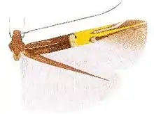 Female. Forewing length 4.9 mm. Head: frons shining white with greenish and reddish reflections, vertex neck tufts and collar shining olive brown with greenish and reddish reflections; labial palpus first segment very short, white, second segment three-quarters of the length of third, greyish brown with white longitudinal lines laterally and ventrally, third segment white, lined brown laterally, extreme apex white; scape dark brown with a white anterior line, white ventrally, antenna shining dark brown with a white line from base to two-thirds, interrupted in middle, followed towards apex by eleven dark brown segments, nine dark brown with a white line and eighteen dark brown segments at apex. Thorax and tegulae shining olive brown with greenish and reddish gloss. Legs: shining dark brown with reddish gloss, femur of midleg shining ochreous, femur of hindleg shining golden, foreleg with a white line on tibia and tarsal segments one, two and five, tibia of midleg with a white narrow oblique basal line, a white oblique medial line and a white apical ring, tarsal segment one with a lateral white line on the outside, ending dorsally at apex, segment two with a white oblique streak in the distal half and segment five entirely white, tibia of hindleg as midleg, but the markings silvery and with an additional broad pale golden subapical ring and long hair pencils before and after the medial line, tarsal segment four dorsally white at apex and segment five dorsally entirely white, spurs ochreous-white dorsally, dark grey ventrally, tips white. Forewing shining olive brown in basal one-quarter, darker brown towards apex and with reddish gloss, four very narrow white lines in the basal area, a subcostal from base to one-quarter, bending from costa in distal third, a medial above fold, from base to two-fifths, a very short subdorsal from one-fifth, a short dorsal from beyond base to one-fifth, an orange-yellow transverse fascia beyond the middle with a long apical protrusion from the middle and as an apical line to apex, bordered at the inner edge by a tubercular very pale golden metallic fascia with greenish and reddish reflections, subcostally on outside with patch of blackish scales, bordered at the outer edge by two very pale golden tubercular costal and dorsal spots with purplish reflection, the costal spot as a streak of one-quarter wing length, the dorsal spot more or less square and more towards base than the costal, both spots lined brown on the inside, a white costal streak beyond the costal spot, cilia brown, slightly paler towards dorsum. Hindwing shining brown with strong reddish gloss, cilia brown. Underside: forewing shining dark brown, the pale yellow apex line distinctly visible in the cilia as a white streak, hindwing shining dark brown. Abdomen not examined, previously used for dissection.[1]