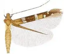 Male. Forewing length 3.7 mm. Head: frons shining grey, in middle a shining white streak, vertex and neck tufts shining bronze brown with some reddish reflection, laterally lined white, collar shining bronze brown; labial palpus first segment very short, white, second segment three-quarters of the length of third, dark brown with white longitudinal lines laterally and ventrally, third segment white, lined brown laterally, extreme apex white; scape dorsally dark brown with a white anterior line, ventrally white, antenna shining dark brown with a white interrupted line from base to two-fifths with a short uninterrupted section at base, two indistinct subapical greyish rings of two segments each, separated by two dark brown segments at three-quarters, apical part of eighteen segments greyish brown. Thorax and tegulae shining bronze brown with reddish gloss. Legs: shining dark brown, femur of hindleg shining golden, foreleg with a white line on tibia and tarsal segments one and two, segment four with a white apical ring, segment five entirely white, tibia of midleg with silvery white oblique basal and medial lines and a white apical ring, tarsal segments one, two and four with white apical rings, segment five dorsally white, tibia of hindleg with a silvery metallic basal streak, silvery metallic medial and subapical rings, and a white apical ring, tarsal segments one to three with white apical rings and segment four and five entirely white, spurs dark brown, apically lighter. Forewing with basal one-sixth shining bronze brown with reddish gloss, remaining part shining dark brown with reddish gloss, at one-fifth three short silver metallic streaks with bluish reflection, a subcostal, a medial just above fold and slightly further from base than the subcostal and a subdorsal, slightly further from base than the medial, a tubercular silver metallic fascia with greenish and purplish reflections in the middle, perpendicular on dorsum and with a large square bronze brown spot on dorsum on the outside, at two-thirds a tubercular silver metallic dorsal spot with bluish reflection, at three-quarters a tubercular pale golden costal spot, smaller than the dorsal spot, edged by a narrow white costal streak, apical line as a short silver metallic streak with bluish reflection in the middle of the apical area and a broad white spot in the cilia at apex, cilia dark brown, paler on dorsum towards base. Hindwing shining dark greyish brown, cilia dark brown. Underside: forewing shining dark greyish brown with the white costal streak and apical spot distinctly visible, hindwing greyish brown. Abdomen dorsally shining pale ochreous-brown with reddish gloss, laterally with golden and greenish reflections, ventrally shining dark brown, segments broadly banded shining white posteriorly, anal tuft greyish brown.[1]