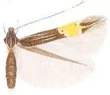 Male, female. Forewing length 4.2-4.5 mm. Head: frons shining pale grey with greenish reflection, vertex and neck tufts bronze brown, posteriorly olive brown, laterally lined white; labial palpus first segment very short, white, second segment three-quarters of the length of third, dark brown with white longitudinal lines laterally and ventrally in apical half, third segment white, lined dark brown laterally; scape dark brown with a white anterior line, white ventrally, antenna shining brown, a white line from base to two-fifths, followed towards apex by ten dark brown segments, one white, one dark brown, eight white, two dark brown, two white, ten dark brown and seven white segments at apex. Thorax and tegulae olive brown, thorax with white median line, tegulae lined white inwardly. Legs: shining dark brown, femora shining ochreous-white, edged shining pale grey on outside, foreleg with a white line on tibia and tarsal segments, tibia of midleg with white oblique basal, medial and apical lines, tarsal segments one and two with white apical rings, segment five entirely white, tibia of hindleg with a very oblique white line from base to beyond one-half and a white apical ring, tarsal segment one with a white basal ring and a white apical streak dorsally, segments two to four with white dorsal streaks, segment five white, spurs white, ventrally with a greyish-brown streak. Forewing olive brown, five narrow white lines in the basal area, a costal from one-third to the transverse fascia, a subcostal from base to one-third, bending from costa in distal half, a medial above fold from one-sixth and ending well before the transverse fascia, a subdorsal below fold from one-quarter and ending just beyond the medial, a dorsal from beyond base to one-quarter, a broad yellow transverse fascia beyond the middle, narrowed towards dorsum and with an apical protrusion, bordered at the inner edge by two pale golden metallic, tubercular subcostal and dorsal spots of similar size, the subcostal with a patch of blackish brown scales on the outside, the dorsal spot further from base, bordered at the outer edge by two similarly coloured costal and dorsal spots, both spots opposite, the costal spot edged brown on the inside and with a white costal streak, the dorsal spot about twice as large as the costal, a shining white apical line from the apical protrusion to apex, cilia ochreous-brown. Hindwing shining greyish brown, cilia ochreous-brown. Underside: forewing shining brown, the white costal streak and apical line distinctly visible, hindwing costal half shining brown, dorsal half shining grey. Abdomen dorsally shining brown, seventh segment banded yellowish white posteriorly, ventrally shining dark grey, segments banded shining greyish white posteriorly, anal tuft yellowish white, in female ventrally shining white, anal tuft white, further as male.[1]