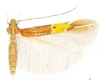 Male. Forewing length 3.9 mm. Head: frons shining white, vertex and neck tufts shining ochreous-brown, laterally and medially lined white, collar ochreous-brown; labial palpus first segment very short, white, second segment four-fifths of the length of third, greyish brown with white longitudinal lines laterally and ventrally, third segment white, lined brown laterally, scape dorsally dark brown with a white anterior line, ochreous-white ventrally, antenna shining dark brown with a white interrupted line from base to beyond one-half with a short section uninterrupted at base, followed towards apex by a dark brown section of approximately fifteen segments, five white, one dark brown, three white and one dark brown segment at apex. Thorax and tegulae ochreous-brown, thorax with white median line, tegulae lined white inwardly. Legs: ochreous-grey, foreleg with a white line on tibia and tarsal segments one to three and five, tibia of midleg with white oblique basal and medial lines and a white apical ring, tarsal segments ochreous, segments three and four more grey, tibia of hindleg as midleg, tarsal segments one to three with indistinct ochreous apical rings, segments four and five entirely ochreous, spurs ochreous on outside, paler on inside. Forewing ochreous-brown, four white lines in the basal area, a subcostal from one-eighth to one-quarter, bending slightly from costa distally, a slightly oblique medial above fold, from one-sixth to one-third, a subdorsal just beyond the start of the medial almost to the transverse fascia, a dorsal opposite to the subcostal, a broad yellow transverse fascia beyond the middle, slightly narrowed towards dorsum with a short apical protrusion, bordered at the inner edge by a pale golden metallic fascia, narrowed towards costa, not reaching it and with a subcostal patch of blackish brown scales on the outside, bordered at the outer edge by two pale golden metallic costal and dorsal spots, the dorsal spot twice as large as the costal and more towards base, a white costal streak beyond outer costal spot, a white apical line to apex from beyond the apical protrusion, cilia ochreous-brown, ochreous-grey towards dorsum. Hindwing shining pale ochreous-grey, cilia ochreous-grey. Underside: forewing shining pale greyish ochreous, the white costal streak and the apical line in the cilia at apex indistinctly visible, hindwing shining pale grey. Abdomen dorsally shining ochreous-grey, ventrally shining pale grey, segments broadly banded shining white posteriorly, anal tuft white.[1]