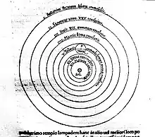 The idea of celestial spheres was developed in the cosmological models of Plato, Eudoxus, Aristotle, Ptolemy, Copernicus, and others.[10] They believed in a stable cosmos created by God, where distinct realms were subject to different kinds of order. Some Europeans maintained the Aristotelian view that infinity could only be seen as an attribute of God, with the cosmos being finite. Furthermore, following the Aristotelian view that "nature abhors a vacuum", some Europeans believed that the space between the spheres were filled with air.[9] This theory persisted until the Scientific Revolution, when the discovery that the Sun was in the center of the planetary system rocked cosmological understanding to its core. Other theories such as Atomism posited a void of atoms as the fundamental elements of physics, while Stoicism postulated a void allowing for the cosmos to expand and contract in volume through its cycles.[11][12]