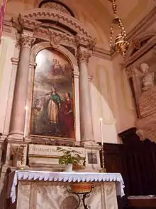 In 1831 he was commissioned to paint the main altarpiece depicting Saints Peter and Paul and another altarpiece of Virgin of the Rosary and St Dominic for the parish church of the same name in Sexten in Tyrol.[7] He painted St Luke painting the Virgin (right lateral altar, 1833) and the Assumption of Mary (1834, main altarpiece) of the Sanctuary of Santa Assunta of Maria Luggau in West Carinthia. He also painted frescoes on the Resurrection of the Dead for the chapel in the cemetery of Cortina d'Ampezzo.[8] Among his other religious paintings are his Adoption of the Habit by St Gertrude (1835)[9] for the main altar of the parish church of Mühlwald;[10] in 1836 he completed an altarpiece depicting a Santa Maria Assunta (1836) for the side altar of a parish church near Bruneck; a Crucifixion for the parish church of St Michael at Brixen; and a Glory of Saint Catherine for the main altar of the parish church of Graun im Vinschgau;[11] and a Transit of St Joseph (1839) for the church of San Luca Evangelista in Padua.[12]