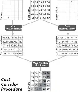 The algorithm to derive this corridor field is created by generating two cost accumulation grids: one using the source as described above. Then the algorithm is repeated, but using the destination as the source. Then these two grids are added using map algebra. This works because for each cell, the optimal source-destination path passing through that cell is the optimal path from that cell to the source, added to the optimal path from that cell to the destination. This can be accomplished using the cost accumulation tool above, along with a map algebra tool, although ArcGIS provides a Corridor tool that automates the process.