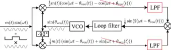 In the simplest case . Therefore, does not affect the input of the noise-reduction filter. The carrier and voltage-controlled oscillator (VCO) signals are periodic oscillations with high-frequencies . The block is an analog multiplier.