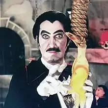 Count Gore de Vol is a television horror host who originally appeared on Washington, D.C.'s WDCA from 1973 to 1987.[1] Originally named M.T. Graves and played by announcer Dick Dyszel, the character first appeared on the WDCA version of the Bozo the Clown program. When the character got a positive reaction, he was given his own program, called Creature Feature. The choice of Gore de Vol as the character's name was either a pun involving the name of acerbic author Gore Vidal or the name of a prominent Washington, D.C. funeral home, "de Vol". Gore de Vol became the Washington/Baltimore area's longest-running horror host, broadcast every Saturday night on WDCA from March 1973 to May 1987.[2] He returned to the D.C. airwaves for a one-time special, Countdown with the Count, on New Year's Eve 1999.