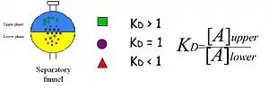 The countercurrent separation starts with choosing an appropriate biphasic solvent system for the desired separation. A wide array of biphasic solvent mixtures are available to the CCC practitioner including the combination n-hexane (or heptane), ethyl acetate, methanol and water in different proportions.[24] This basic solvent system is sometimes referred to as the HEMWat solvent system. The choice of solvent system may be guided by perusal of the CCC literature. The familiar technique of thin layer chromatography may also be employed to determine an optimal solvent system.[25] The organization of solvent systems into "families" has greatly facilitated the choice of solvent systems as well.[26] A solvent system can be tested with a one-flask partitioning experiment. The measured partition coefficient from the partitioning experiment will indicate the elution behavior of the compound. Typically, it is desirable to choose a solvent system where the target compound(s) have a partition coefficient between 0.25 and 8.[27] Historically, it was thought that no commercial countercurrent chromatograph could cope with the high viscosities of ionic liquids. However, modern instruments that can accommodate 30 to 70+ % ionic liquids (and potentially 100% ionic liquid, if both phases are suitably customized ionic liquids) have become available.[28] Ionic liquids can be customized for polar / non-polar organic, achiral and chiral compounds, bio-molecule, and inorganic separations, as ionic liquids can be customized to have extraordinary solvency and specificity.[29]