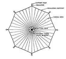 A common design for a counterpoise is a series of radial wires suspended a few feet above the ground, extending from the base of the antenna in all directions in a "star" pattern, connected at the center.[2] The counterpoise functions as one plate of a large capacitor, with the conductive layers in the earth as the other plate.[2] Since the radio frequency alternating currents from the transmitter can pass through a capacitor, the counterpoise functions as a low-resistance ground connection. There should not be any closed loops in the wires of a counterpoise system, as the strong fields of the antenna will induce circular currents in it which will dissipate transmitter power.
