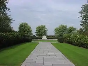 The Courcelette Memorial sits beside the D929 (Albert-Bapaume) roadway, just south of the village of Courcelette itself. The site is a small square park with gardens of hedges and a variety of maple trees. The choice to not have a wide variety of colours in the gardens is a conscious attempt to help the visitor focus their visit on contemplating the considerable sacrifice and cost the Canadians shouldered during the battle.[1] A 'Y' shaped pathway leads from the entrance to stone seats at several places around the outer edge looking out at the former battlefield. In the centre of the park the grey granite block monument is set on a low circular flagstone terrace.[2]