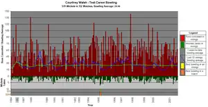 His highest score, coincidentally, was 30 in both forms of the game. By the end of his career, he had such a reputation for poor batting that the crowd would cheer every ball he faced.[2] Whether this was in appreciation of his batting or an attempt to wind up the bowling side is open to interpretation. His most significant (if scoreless) innings came when he kept Brian Lara company during a last-wicket stand to ensure victory in the match (and thus a draw in the series) against Australia in the Third Test in 1999 (Walsh also took seven wickets in the match).[15] A trademark of his batting was an elaborate windmilling leave-alone. Walsh is a much loved and respected cricketer and the West Indies have yet to find a fast bowler with anything approaching his talents.