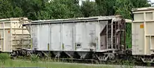 A covered hopper is a self-clearing enclosed railroad freight car with fixed roof, sides, and ends with openings for loading through the roof and bottom openings for unloading. Covered hopper cars are designed for carrying dry bulk loads, varying from grain to products such as sand and clay.[1] The cover protects the loads from the weather. Dry cement would be very hard to unload if mixed with water in transit, while grain would be likely to rot if exposed to rain.
