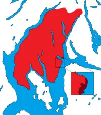 The northern part of the peninsula is covered by the Argyll Forest Park managed by Forestry and Land Scotland.[5] The Arrochar Alps[6] and Ardgoil peninsula in the north fringe the edges of the sea lochs whilst the forest park spreads out across the hillsides and mountain passes, making Cowal one of the remotest areas in the west of mainland Scotland. The Loch Lomond and The Trossachs National Park extends into Cowal.[7] The peninsula is separated from Knapdale by Loch Fyne, and from Inverclyde and North Ayrshire to the east by the Firth of Clyde.[8] Loch Long and its arm, Loch Goil are to the north-east. The south of the peninsula is split into three forks by Loch Striven and Loch Riddon (Loch Ruel). The Isle of Bute lies to the south separated by the narrow Kyles of Bute which connect the Firth of Clyde to Loch Riddon.