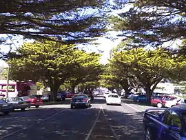 The main road of the island (Phillip Island Road) leads into Cowes and becomes the town's main road, Thompson Avenue. A distinctive feature of the road is the 1 km lining of Golden Cypress trees which were planted in the early 20th century. Further into town, the road begins a gradual descent before it terminates with a T-intersection at the waterfront. As the road approaches the waterfront, density of restaurants and general retail outlets increases. Retailers in Cowes include Coles, Woolworths, Aldi, IGA and Dimmeys. Cowes Jetty was built at the end of Thompson Avenue in 1870 and remains a focal point of the town. It is flanked by sheltered beaches which are a popular attraction for families. An annual fireworks event was held at 9pm on New Year's Eve until in 2010 when they were cancelled and reinstated in 2017. Occasionally a container ship can be seen from the waterfront heading to or from the port at Hastings which is located to the north.