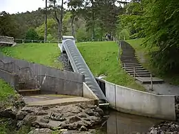 After his first visit in 1869, Shaw described the house in a letter to his wife, noting the "wonderful hydraulic machines that do all sorts of things you can imagine".[2] By building dams, Armstrong created five new lakes on the estate, Debdon, Tumbleton, Blackburn, and the Upper and Lower lakes at Nelly's Moss.[105] In 1868, a hydraulic engine was installed. Inspired by a watermill on the Dee in Dentdale,[106] in 1870 Armstrong installed a Siemens dynamo in what was the world's first hydroelectric power station.[68] The generators, which also provided power for the farm buildings on the estate, were constantly extended and improved to meet the increasing electrical demands in the house. The 2006 regeneration project included extensive rewiring.[46] A new screw turbine, with a 17-metre (56 ft)-long Archimedes' screw, was installed in 2014; it can provide 12 kW, supplying around 10 per cent of the property's electricity consumption.[lower-alpha 6][108]