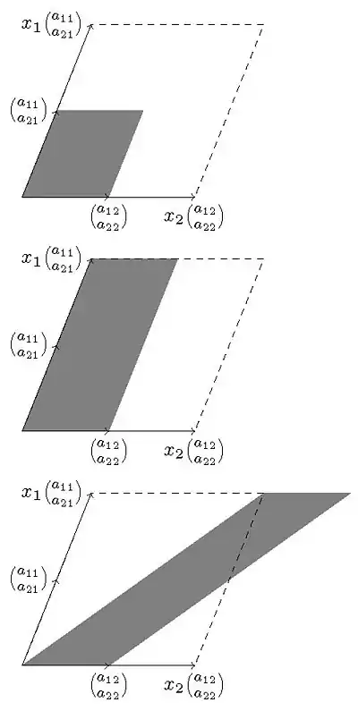 Therefore, the area of the parallelogram determined by and has to be times the area of the first one since one of the sides has been multiplied by this factor. Now, this last parallelogram, by Cavalieri's principle, has the same area as the parallelogram determined by and