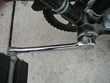 This configuration consists of a left crank arm with a spider and chainring, and a right crank arm without a spider, the opposite of a normal configuration. If used with a screw-on freewheel, a special hub with a left hand thread for a special freewheel must be used, which is also threaded left hand and ratchets the opposite direction of a normal freewheel. If the freewheel and hub were threaded with right hand threads, the torque applied by pedaling would loosen and unthread the freewheel from the hub.