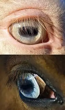 Cream coat colors are described by their relationship to the three "base" coat colors: chestnut, bay, and black. All horses obtain two copies of the SLC45A2 gene; one from the sire, and one from the dam. A horse may have the cream allele or the non-cream allele on each gene. Those with two non-cream alleles will not exhibit true cream traits. Horses with one cream allele and one non-cream allele, popularly called "single dilutes," exhibit specific traits: all red pigment in the coat is gold, while the black pigment is either unaffected or only subtly affected.[1][2] These horses are usually palomino, buckskin, or smoky black. These horses often have light brown eyes.[3] Horses with two copies of the cream allele also exhibit specific traits: cream-colored coats, pale blue eyes, and rosy-pink skin. These horses are usually called cremello, perlino, or smoky cream.