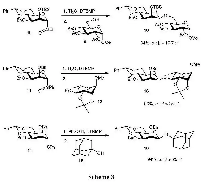 Some representative examples of Crich’s β-mannosylation are shown in Scheme 3.[9] It is noteworthy that, with this method in hand, primary, secondary, and tertiary alcohols (9, 12, and 13) all serve as glycosyl acceptors effectively in terms of yields and selectivity. In a recent version, the β-mannosylation of thioglycoside 14 and its analogues were examined to prepare sterically hindered glycosides, in which PhSOTf (or other newly developed sulfur-type oxidants[10][11]) served as a convenient reagent for the in situ generation of the glycosyl triflate from 14, thus facilitating the reaction.