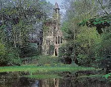 In the garden are an artificial lake and a fine Victorian folly[6] in the form of a Gothic Chapel, the materials of which are thought to have come from the ruins of West Dereham Abbey or a building reclaim yard. It may predate the new house.