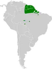 This species is native to the tropical, lowland rainforests of Guyana, French Guiana and northeastern Brazil. There have been occasional sightings outside its normal range, in west Brazil and east Venezuela. It is an uncommon species and is present in the forest canopy and at the verges of woodland.[5]
