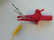 A crocodile clip or alligator clip[1] is a plier-like spring-tensioned metal clip with elongated, serrated jaws that is used for creating a temporary electrical connection. This simple mechanical device gets its name from the resemblance of its serrated jaws to the toothed jaws of a crocodile or alligator. It is used to clamp and grab onto a bare electrical cable to an lead on a battery or some other electrical component. Functioning much like a spring-loaded clothespin, the clip's tapered, serrated jaws are forced together by a spring to grip an object. When manufactured for electronics testing and evaluation, one jaw of the clip is typically permanently crimped or soldered to a wire, or is bent to form the inner tubular contact of a ~4 mm (0.16 in) female banana jack, enabling quick non-permanent connection between a circuit under test and laboratory equipment or to another electrical circuit. The clip is typically covered by a plastic shroud or "boot" to prevent accidental short-circuits.