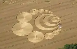 A crop circle, crop formation, or corn circle is a pattern created by flattening a crop,[1] usually a cereal. The term was first coined in the early 1980s by Colin Andrews.[2] Crop circles have been described as all falling "within the range of the sort of thing done in hoaxes" by Taner Edis, professor of physics at Truman State University.[3] Although obscure natural causes or alien origins of crop circles are suggested by fringe theorists,[4] there is no scientific evidence for such explanations, and all crop circles are consistent with human causation.[5][6][7]