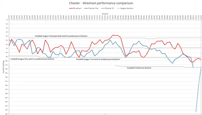 Wrexham edged the English–Welsh derby with 30 victories against Chester's 26 in Football League meetings. Between 1986 and 2005, the sides were in the same division for just one season (1994–95) but they were then Football League Two opponents in the three campaigns from 2005–06 to 2007–08. In 2009–10 the sides clashed again in the Conference National after Chester followed Wrexham out of the Football League (although they would only meet once with that game, a 0-0 draw at Wrexham, expunged due to Chester being expelled and going out of business midway through the 2009-10 campaign).