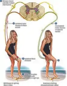 The crossed extensor reflex or crossed extensor response or crossed extension reflex is a reflex in which the contralateral limb compensates for loss of support when the ipsilateral limb withdraws from painful stimulus in a withdrawal reflex.[1] During a withdrawal reflex, the flexors in the withdrawing limb contract and the extensors relax, while in the other limb, the opposite occurs as part of the crossed extensor reflex.[2] Besides shifting the body weight to the other side, the reflex pathway is also associated with leg coordination when walking by flexing muscle on one side, while extending muscle on the other side.[1] This crossed extensor response is properly part of the withdrawal reflex.[3]