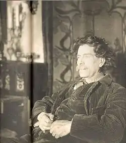 The poet Maurice Rollinat (1846-1903), godson of George Sand, retired to Fresselines in 1883 to continue his work there. He was surrounded with friends with whom he shared the last years of his life. Maurice Leblanc visited Rollinat, whom he had known in Paris.[10] In 1886, he published l'Abîme (The Abyss), then Paysages et Paysans (Landscapes and Peasants) and a prose collection En errant (Wandering).[11] On Rollinat's death in 1903, Auguste Rodin offered the Fresselines commune a bas-relief entitled "Poet and the Muse". This sculpture is on display on the wall of the village church.