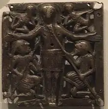 The Clonmacnoise Crucifixion Plaque dates from the late-10th or early-11 century.[6] Christ's head and arms are outsized compared to the rest of his body, and he is clothed in a long garment reaching his knees, and smiling despite the nail-heads or puncture wounds in the palms of each of his hand incurred from the spears held by Stephaton and Longinus.[25] The plaque contains a number of resemblances to a panel on a cross on the Calf of Man island off the southwest coast of the Isle of Man, in which Christ is depicted with a moustache, forked beard and long hair, similar to the cleric on one of the short sides on the Soiscél Molaisse.[26] Acquired by the NMI in 1935.[11]
