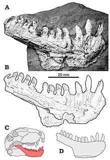 Cryptovenator (Crypto, from Greek kryptos (hidden, secret); venator, from Latin (hunter)) is an extinct genus of sphenacodontid pelycosaurs which existed in Germany during the latest Carboniferous (late Gzhelian age, 300 Ma ± 2.4 Ma). It is known from the holotype LFN−PW 2008/5599−LS, an anterior right mandible fragment, recovered from a dark, fine grained sandstone of the middle Remigiusberg Formation. It was first named by Jörg Fröbisch, Rainer R. Schoch, Johannes Müller, Thomas Schindler and Dieter Schweiss in 2011 and the type species is Cryptovenator hirschbergeri.[1]
