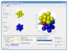 Graphical user interface provides user with two interactive views side by side. These views can display arbitrary combination of the four aforementioned visualization modes allowing to perceive their mutual relations. For instance, rotation of the atomic structure in direct space leads (if set so) to an instant update of the simulated diffraction pattern. If any diffraction spot is selected, corresponding crystallographic planes are shown in the unit cell etc. Such interconnections are implemented for each pair of the four available visualization modes. The electronic visualization allows to simplify understanding of widely used, yet less intuitive representations such as the inverse pole figure. For instance by drawing the coloured triangle of the inverse pole figure into the stereographic projection or to the more intuitive 3D atomic structure.[1]