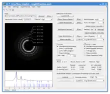 - Interactive diffraction image – allows the user to improve readability of the diffraction image by removing the beam-stopper, subtracting the background, revealing faint or spotty rings or by crystallographic identification of the depicted rings.