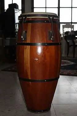 The drum called Conga or tumbadora, of an evident Bantu origin, is, according to Fernando Ortiz: "… a drum from African origin, made of wooden slabs and iron rings, from approximately a meter long, barrel shape, and opened on one end with only one hide drumhead fixed by nails to the body of the drum…" It was tuned using heat in the past, but currently is tuned with metallic tuning pegs.[20]