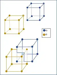 This graphic shows the interlocking simple cubic lattices of cesium and chlorine. You can see them separately and as they are interlocked in what looks like a body-centered cubic arrangement