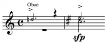 The cued instrument is indicated with text and the cue notes are smaller than the rest. The stems of cue notes all go in the same direction and cue notes are transposed into the key of the part entering.[1]