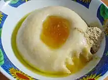 Bazeen or Bazin is also a very recognizable Libyan food.[6] It is made of a mixture of barley flour, with a little plain flour.[7] The flour is boiled in salted water to make a hard dough, then is kneaded into a semi-spherical ball and placed in the middle of a large bowl (women sit on the floor and hold the pan between their legs while using a wooden ladle to mix and kneed the dough to its solid and thick consistency), around which the sauce is poured. The sauce around the dough is made by frying chopped onions with lamb meat, adding turmeric, salt, cayenne pepper, black pepper, fenugreek, sweet paprika, and tomato paste. Potatoes can also be added. Finally, eggs are boiled and arranged around the dome. The dish is then served with a well-known Libyan salad/complement of pickled carrots, cucumber and chili peppers, known as amasyar.[4]