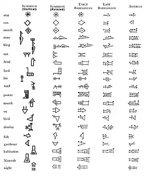 The cuneiform script changed considerably over more than 2000 years. The image below shows the development of the sign SAĜ "head" (Borger nr. 184, U+12295 𒊕). ![]() Evolution of the cuneiform sign SAG "head", 3000–1000 BC Stages:
