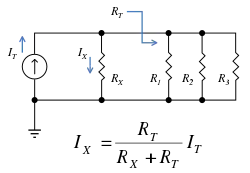 A general formula for the current IX in a resistor RX that is in parallel with a combination of other resistors of total resistance RT is (see Figure 1):
