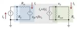 That is, the ideal current gain Ai is reduced not only by the loading factors, but due to the bilateral nature of the two-port by an additional factor[5] ( 1 + β (RL / RS ) Aloaded ), which is typical of negative feedback amplifier circuits. The factor β (RL / RS ) is the current feedback provided by the voltage feedback source of voltage gain β V/V. For instance, for an ideal current source with RS = ∞ Ω, the voltage feedback has no influence, and for RL = 0 Ω, there is zero load voltage, again disabling the feedback.