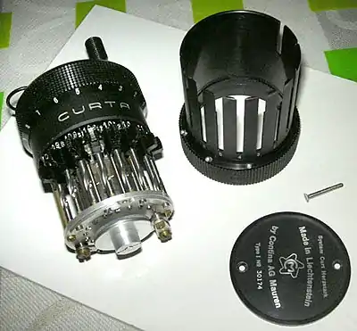 The Curta's design is a descendant of Gottfried Leibniz's Stepped Reckoner and Charles Thomas's Arithmometer, accumulating values on cogs, which are added or complemented by a stepped drum mechanism.