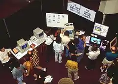 The motivating concept behind the CyberArts International conventions was a desire to bring together artists working in the various new media and the firms producing tools for such work, blending artistic exhibition with trade show. During the day the gatherings featured interactive exhibitions and aisles of traditional exhibit booths found at any ordinary trade show. There were in addition numerous interactive art installations, including some that could be ridden like amusement park rides and others which were for their time cutting edge demonstrations of interactive games. Iconic technologies of the future such as CD-ROMs and virtual reality were demonstrated to participants at these tech expositions.[8] The electronic publisher Jaime Levy exhibited and sold her floppy disk magazine "Cyber Rag" that was created in HyperCard.