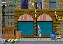 The gameplay is similar to Sega's own Shinobi (1987),[3] as the player has the ability to jump up and down between planes where possible. The goal of each of the game's 15 stages is to find and arrest a specific wanted criminal, who is usually fought at the end of the stage as a boss. Duke is initially armed with only a single-shot pistol, but upon arresting the first three criminals and being promoted to ESWAT, Duke is equipped with a Power Suit with a mounted machine gun for the rest of the game. The suit also has access to limited-use special weapons which can be found within stages. However, both of Duke's standard weapons require ammunition, without which the player can only attack with a kick. Additional ammunition can be found in boxes throughout each stage.