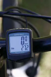 A cyclocomputer, cycle computer, cycling computer or cyclometer is a device mounted on a bicycle that calculates and displays trip information, similar to the instruments in the dashboard of a car. The computer with display, or head unit, usually is attached to the handlebar for easy viewing. Some GPS watches can also be used as display.