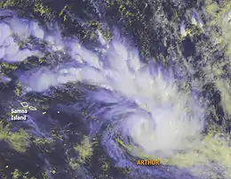 Cyclone Arthur (RSMC Nadi designation: 08F, JTWC designation: 09P) was the eighth tropical depression and fourth tropical cyclone of the 2006–07 South Pacific cyclone season. Forming as tropical depression on January 25, Arthur rapidly intensified into a strong Category 2 cyclone on the Australian intensity scale according to the Regional Specialized Meteorological Centre in Nadi, Fiji. The Joint Typhoon Warning Center assessed the storm to have peaked as a minimal category 1 cyclone. Shortly after peaking in intensity, the cyclone began to weaken due to unfavorable conditions. Quickly moving towards the east-southeast, the Arthur began to undergo an extratropical transition. After turning towards the southeast, the center of circulation was almost fully exposed due to strong wind shear. However, Arthur briefly re-strengthened late on January 26 before becoming extratropical the next day. Tropical Cyclone Arthur affected several small islands during its existence. French Polynesia observed the most noteworthy effects from the storm, where several landslides damaged a few homes.