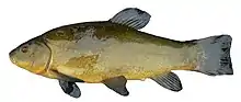 The tench (Tinca tinca), a significant food species farmed in western Eurasia in large numbers, is unusual. It is most often grouped with the Leuciscinae, but even when these were rather loosely circumscribed, it always stood apart. A cladistic analysis of DNA sequence data of the S7 ribosomal protein intron 1 supports the view that it is distinct enough to constitute a monotypic subfamily. It also suggests it may be closer to the small East Asian Aphyocypris, Hemigrammocypris, and Yaoshanicus. They would have diverged roughly at the same time from cyprinids of east-central Asia, perhaps as a result of the Alpide orogeny that vastly changed the topography of that region in the late Paleogene, when their divergence presumably occurred.[24]